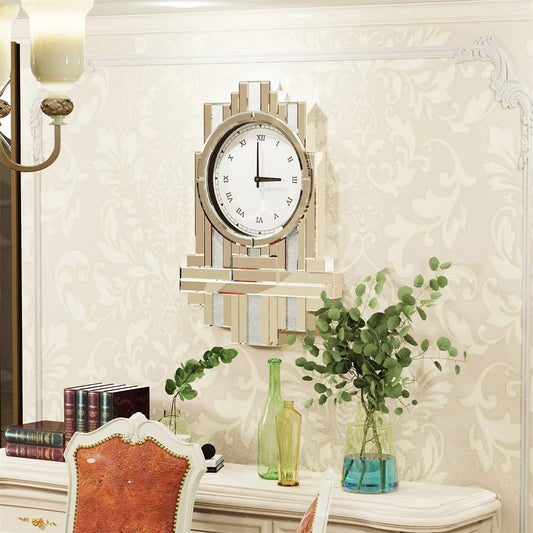 Round Wall Clock Mirror Decorative Silver Glass Mirrors with Roman Numerals Crush Diamond Clocks Battery Operated