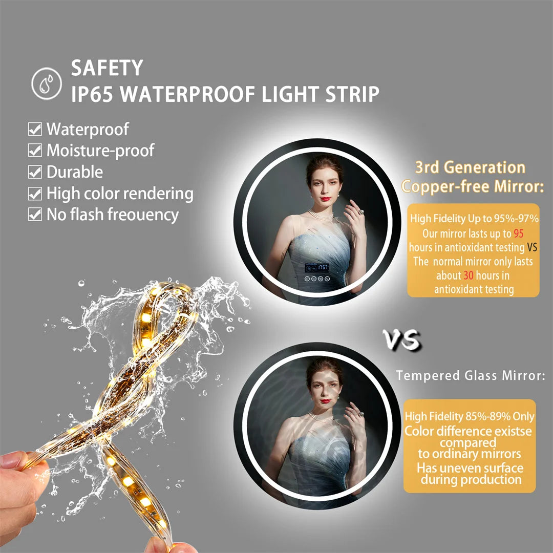 Smart Round Bathroom Mirror with Dual Bluetooth Speakers, Double light,Anti-Fog, Time & Temperature Display
