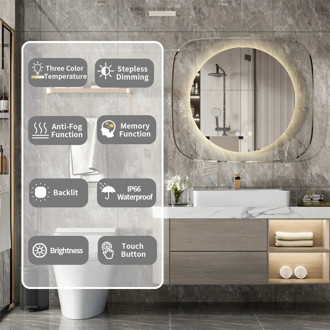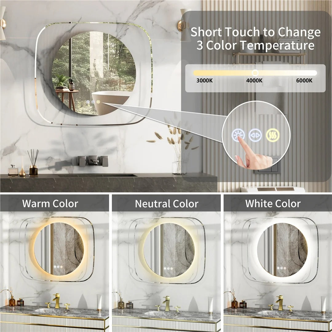 Modern LED Bathroom Mirror with 3-Color Dimmable Backlit and Anti-Fog Feature, 80*70cm